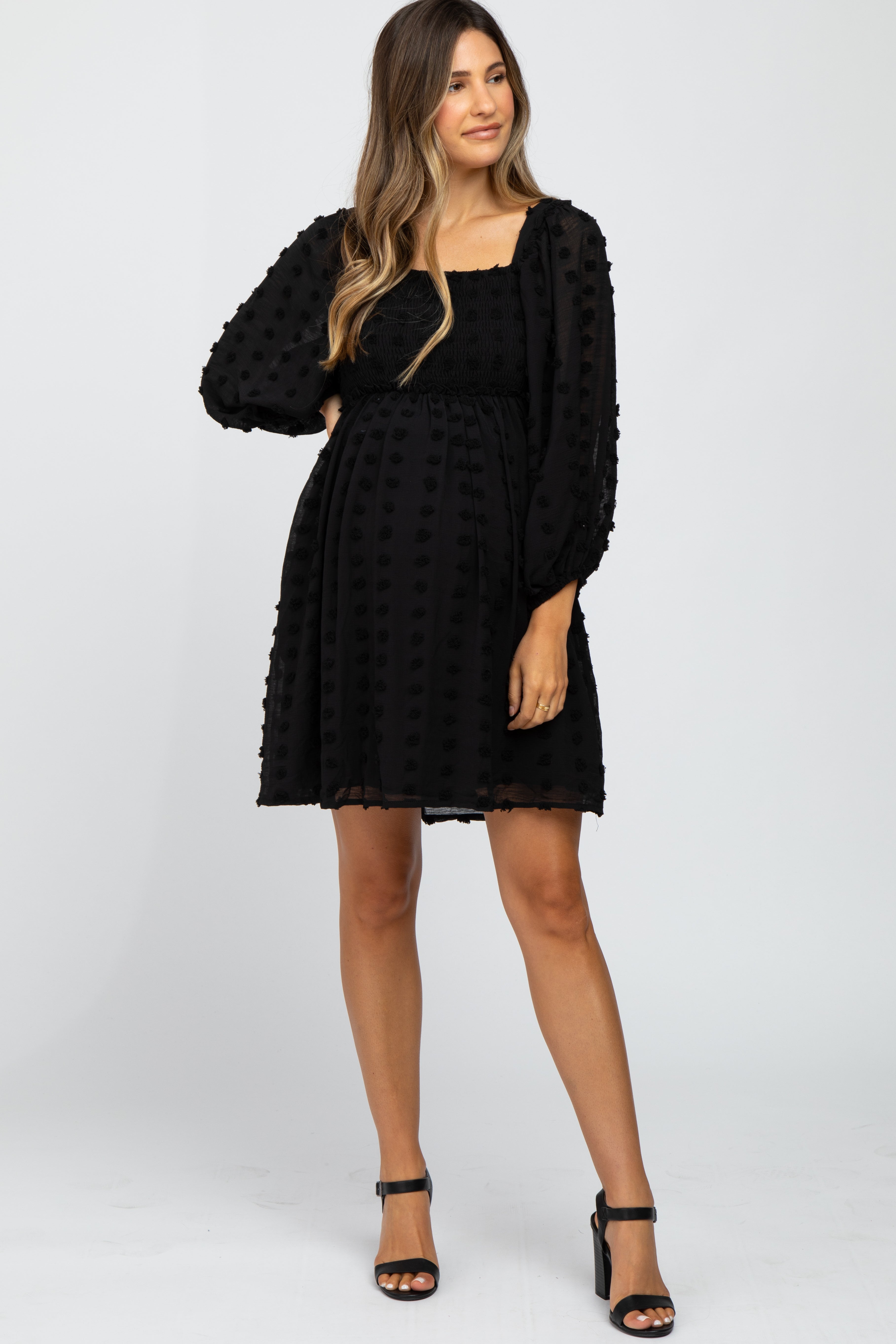 Black Textured Dot Smocked Square Neck Chiffon Maternity Dress
