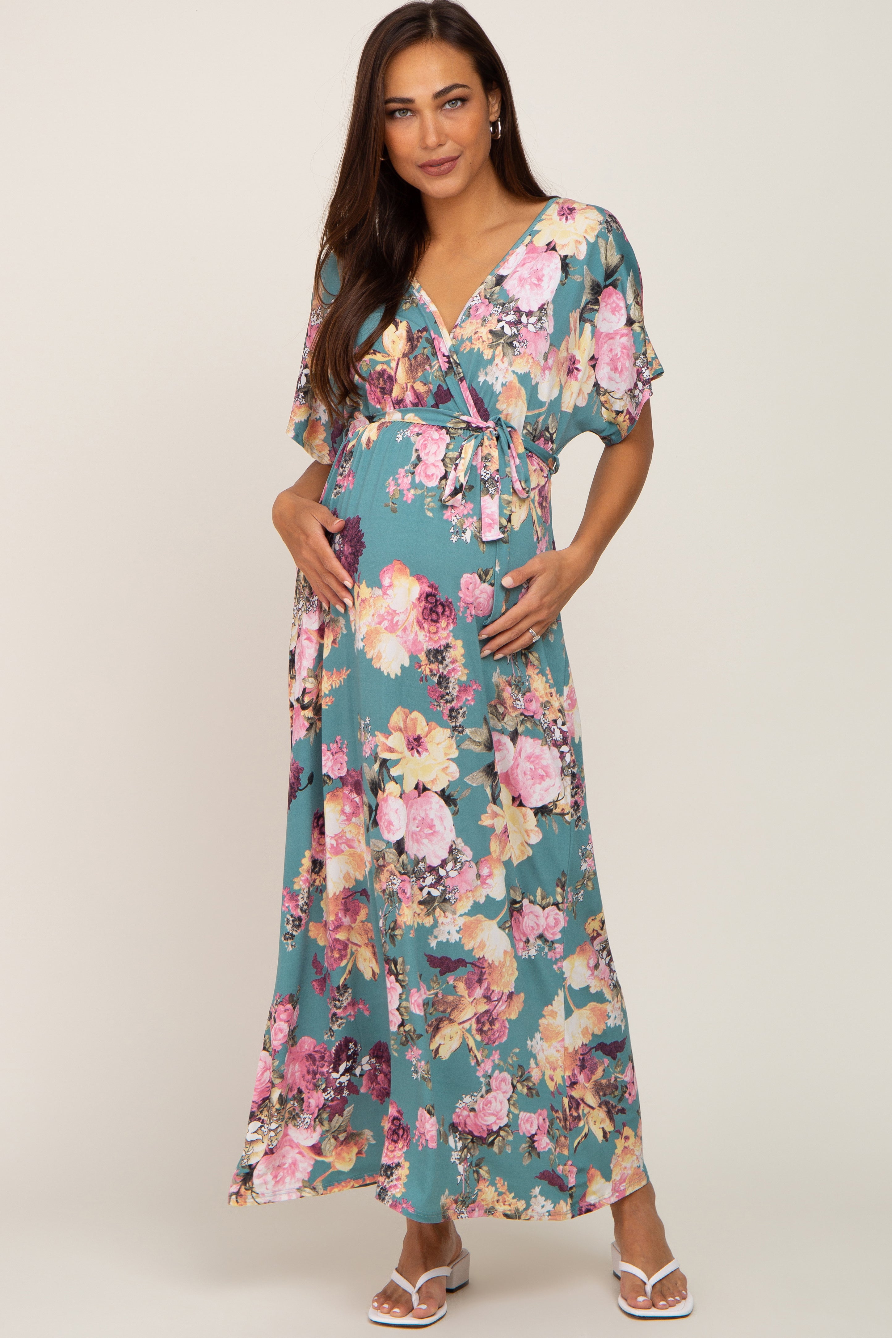 A floral print maternity maxi dress featuring a wrap front v-neckline, short sleeves and a belted adjustable tie.