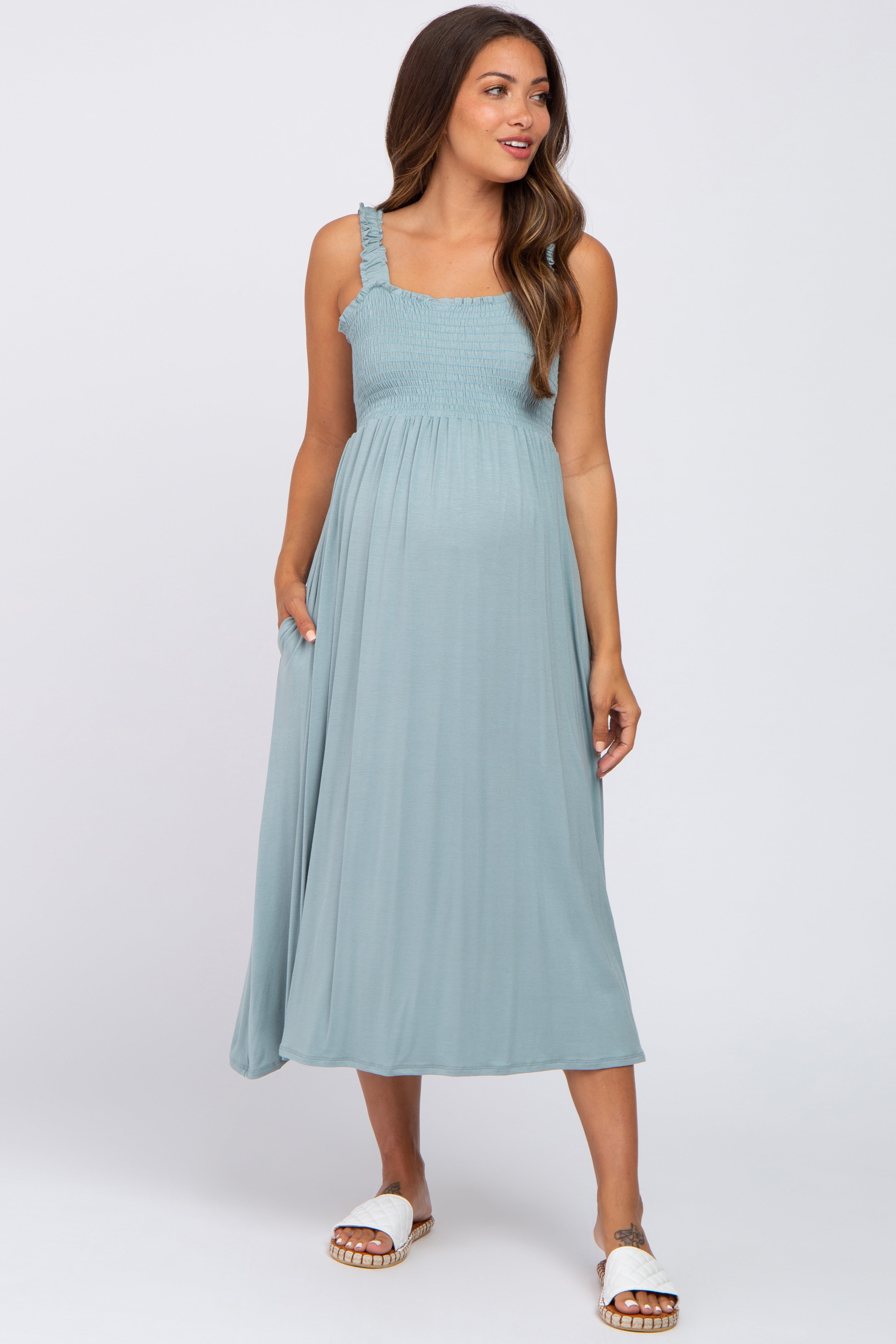 A solid maternity midi dress with ruffle straps and a smocked bodice. Pocketed.