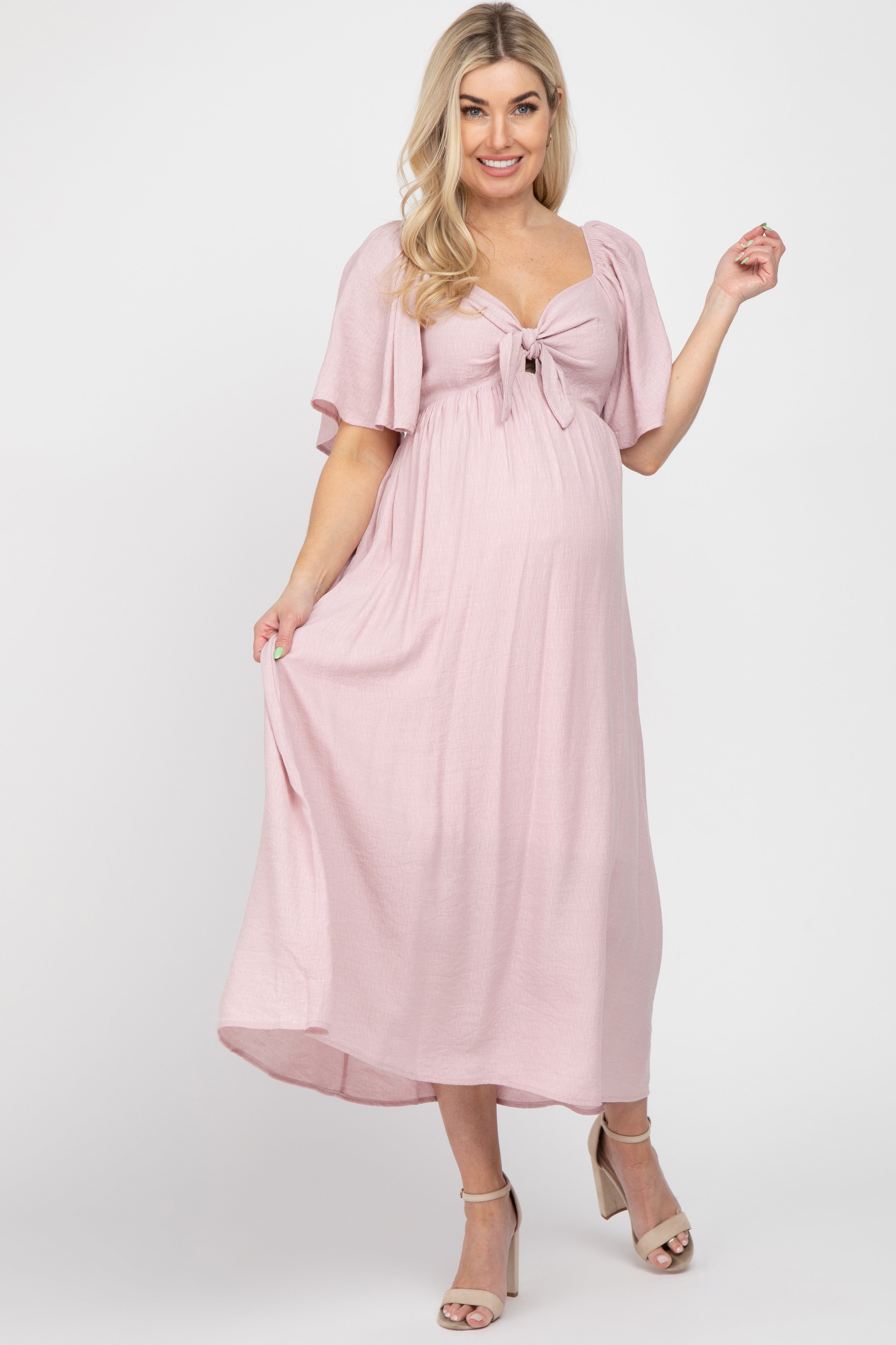 Light Pink Front Tie Ruffle Sleeve Maternity Midi Dress