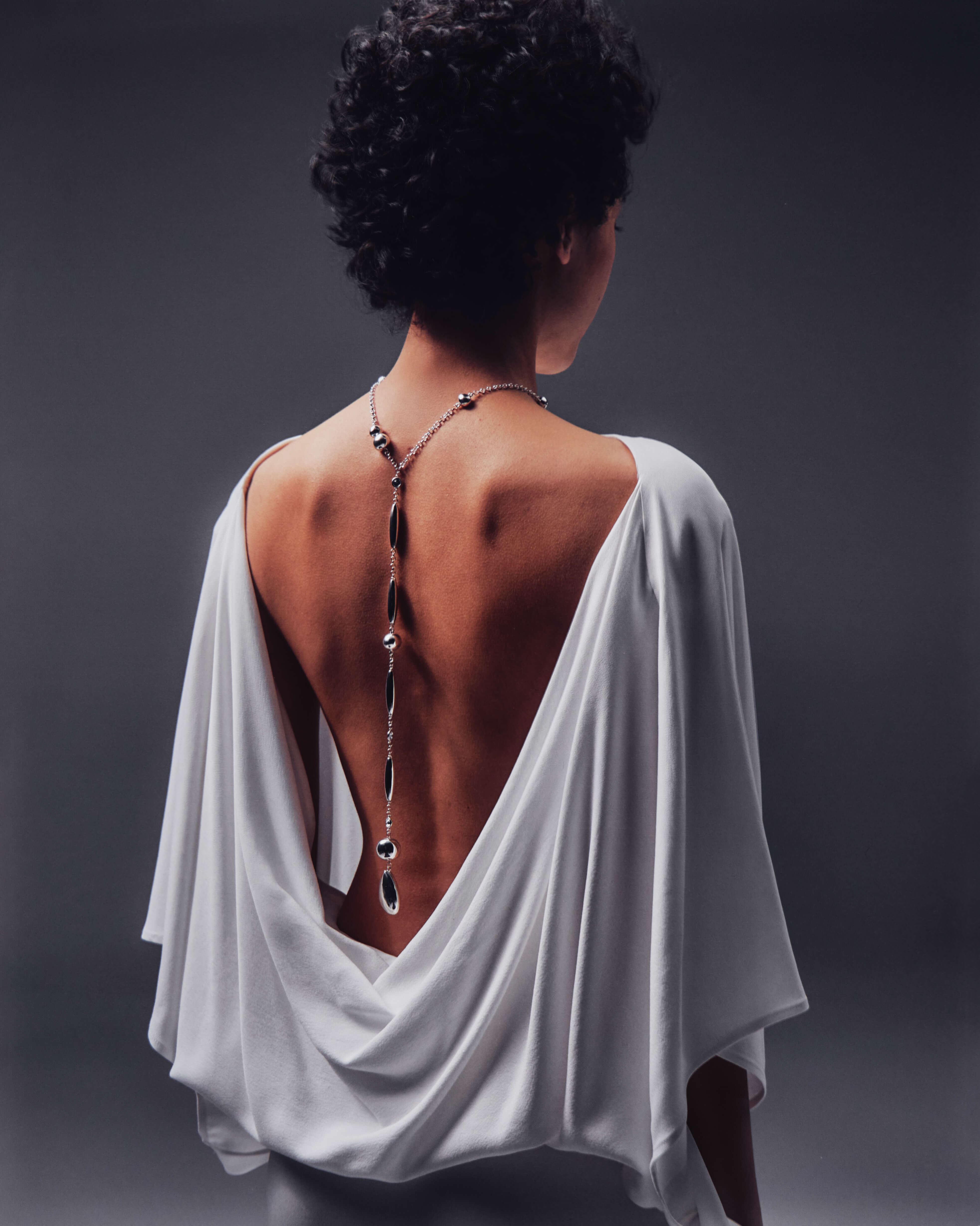 Margot is a masterclass in elegance. Cool and classic from the front with a deeply draped back that dips to the lowest part of your waist.