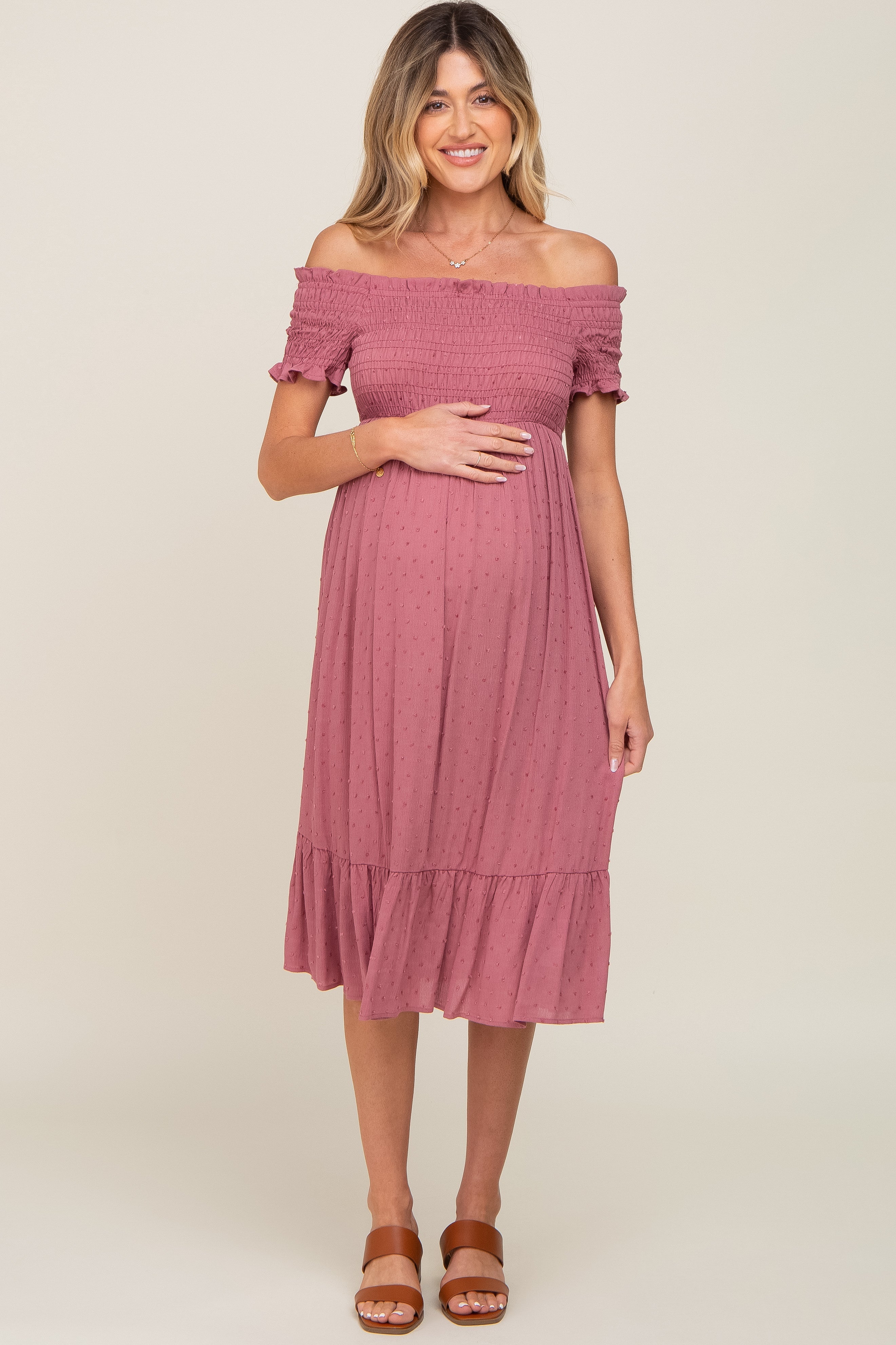 A solid hued maternity midi dress featuring a smocked top, short fitted sleeves, an off shoulder neckline, side pockets and a ruffle hem.