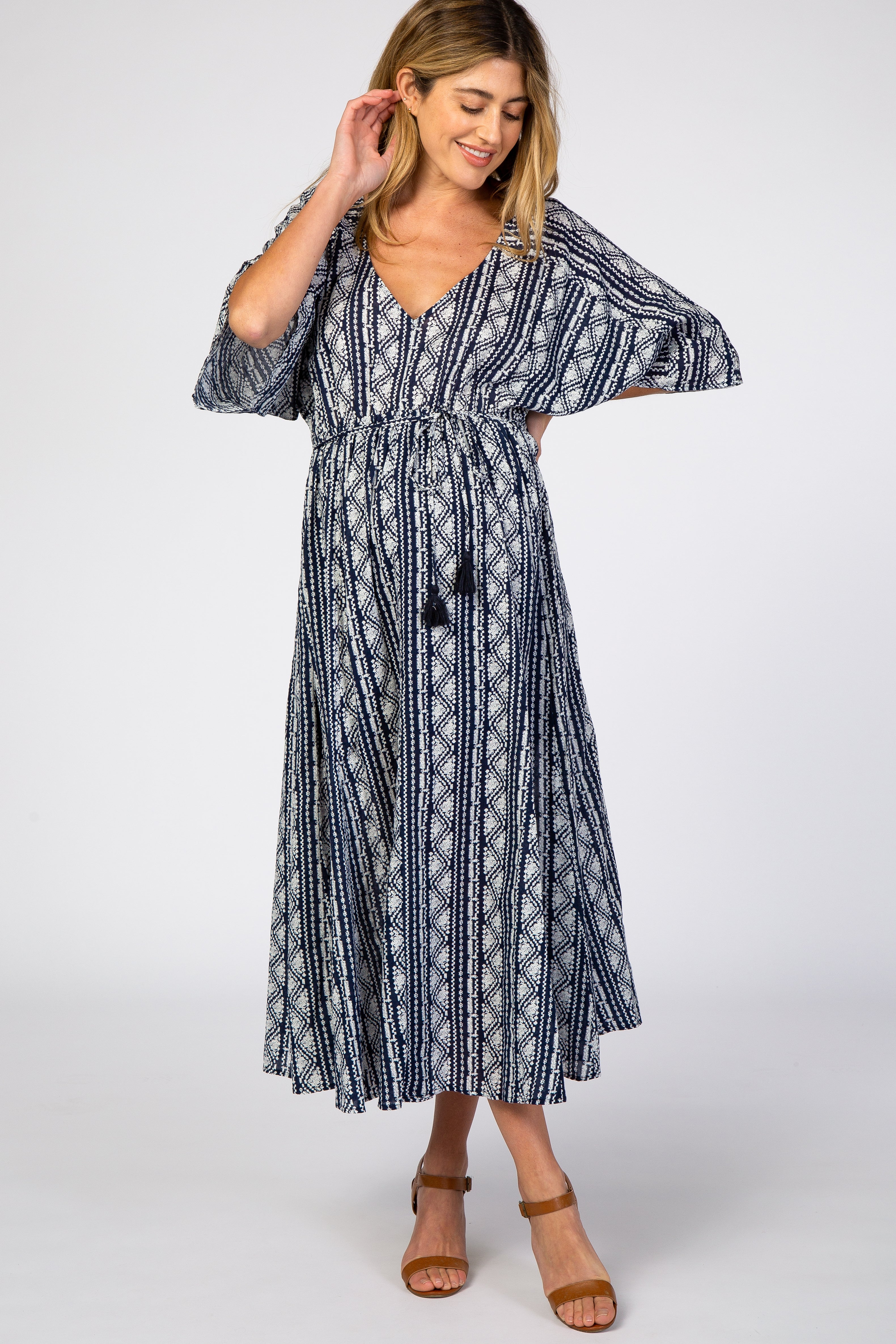 A multi-printed maternity midi dress with short dolman sleeves, a v-neckline, elastic waistband, sash tie with tassel details. Double lined to prevent sheerness. Keyhole cutout with button closure. This style runs small.