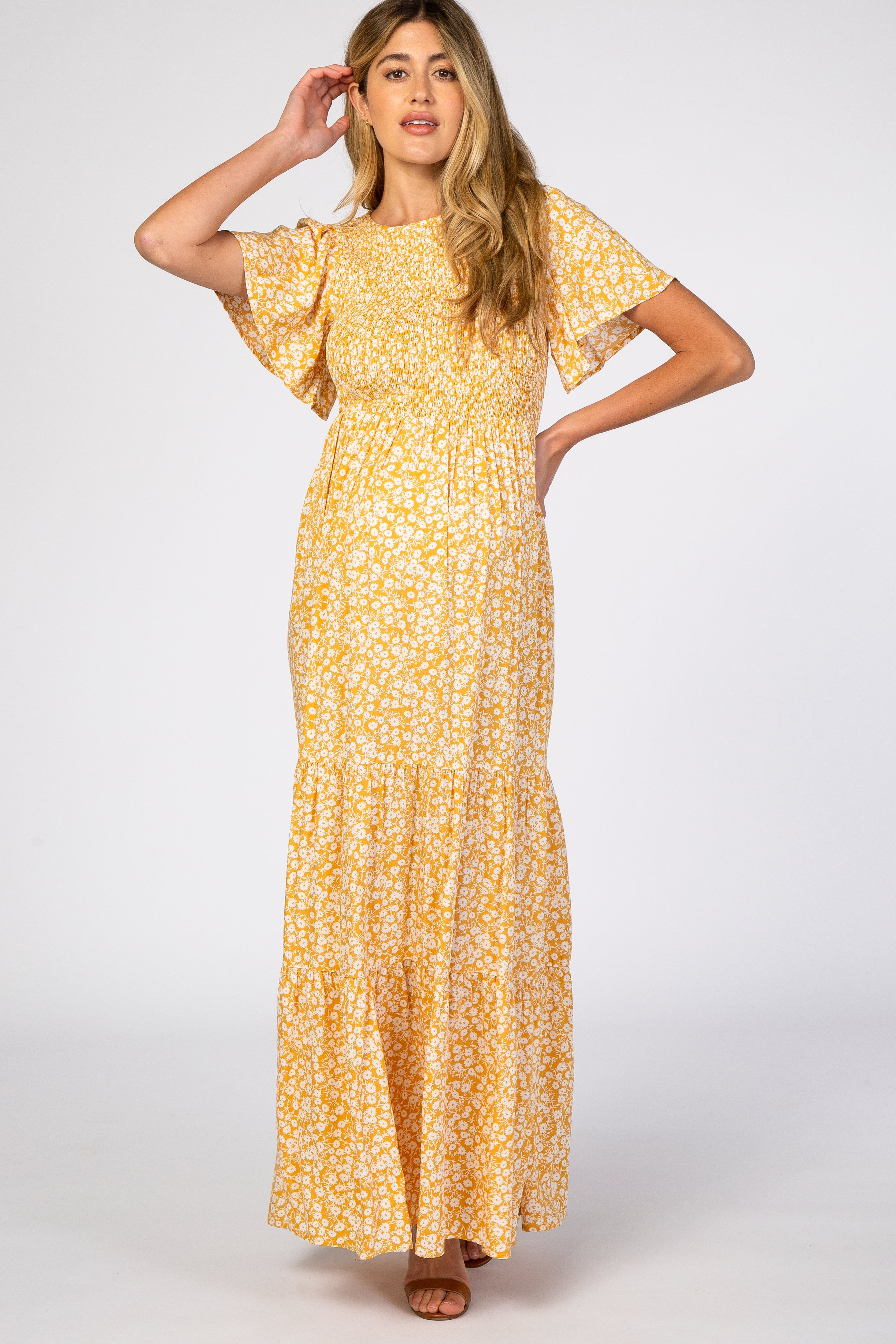 A floral print maternity maxi dress featuring short sleeves, a rounded neckline, a smocked elastic front, a pleated ruffle hem and aback keyhole with an adjustable tie.